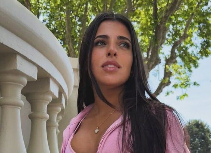 Como accesorio, sumó una minibag rectangular en burdeos con detalles beige, con manija corta y herrajes metálicos. Llevó puesto, además, anteojos de sol tipo aviador con marco negro y cristales oscuros.