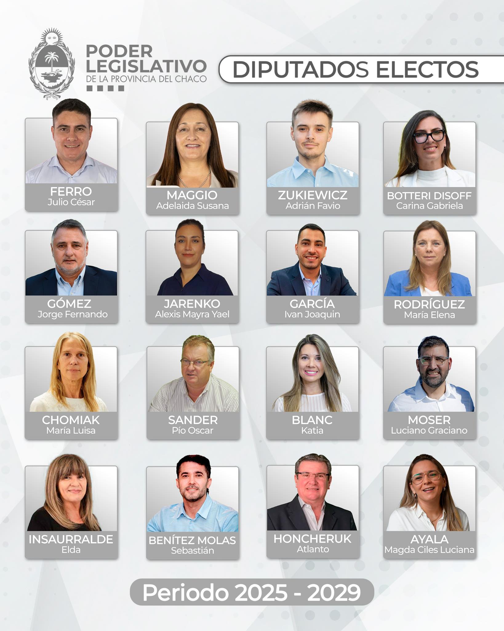 Este lunes 1 de diciembre, a las 18, en el Recinto de Sesiones “Deolindo Felipe Bittel”, se realizará el acto de juramento de las y los 16 legisladores electos, quienes integrarán la Cámara de Diputados del Chaco durante el período 2025-2029.
