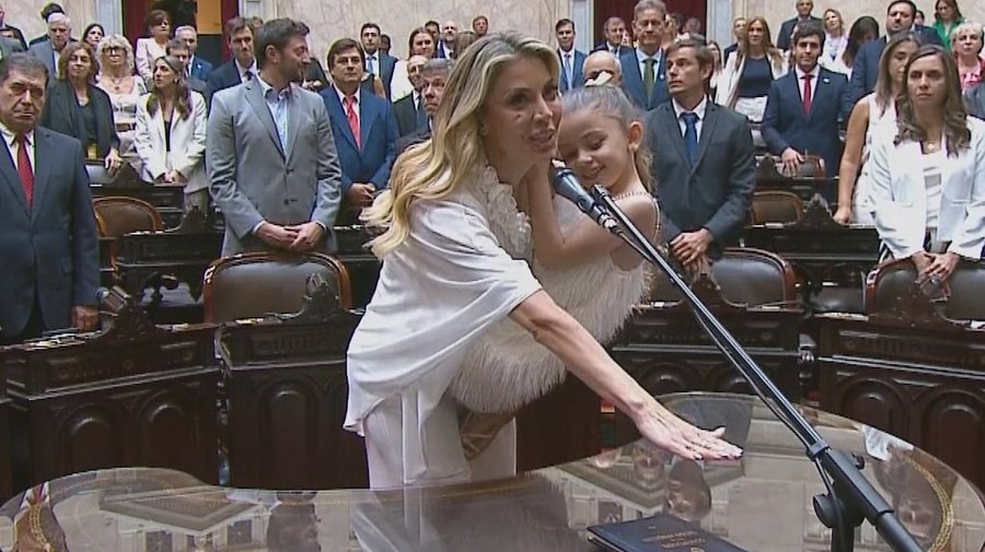 “Como correntina, por la familia, por las infancias y por un futuro mejor para todos, sí juro”, expresó con su hija en brazos. Para la ocasión, la bailarina llevó un look total white, igual que su pequeña.