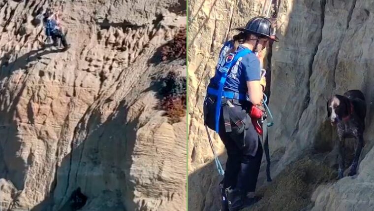 El heroico momento en que los equipos de emergencia rescataron a un perro que cayó por un acantilado